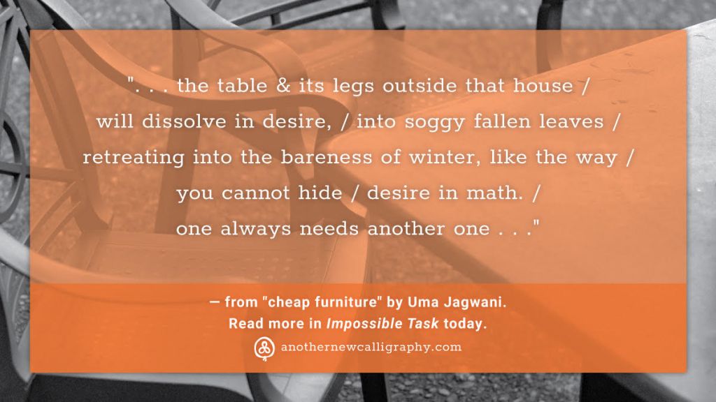 “the old man who lives in my ear,” “cheap furniture,” “noodlz,” “unpeck,” and “no penance necessary,” published in Impossible Task, (Another New Calligraphy’s Online Journal) (2023)